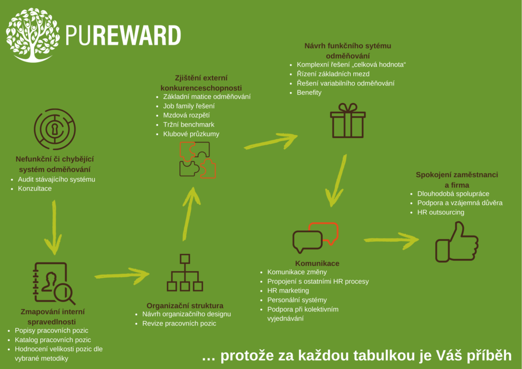 Víme, jak těžké je nastavit funkční odměňovací systém, popsat pracovní pozice, sehnat správně tržní benchmarky. Víme, že provádět změny a komunikovat je na zaměstnance, získat ty nejlepší na trhu a učinit z nich spokojené motivované zaměstnance, je pořádný oříšek. Od toho jsme tu, vaši kolegové, kteří vám pomohou všechno toto zlepšit či nastavit!
